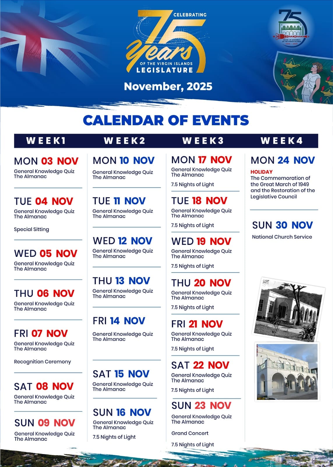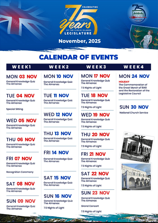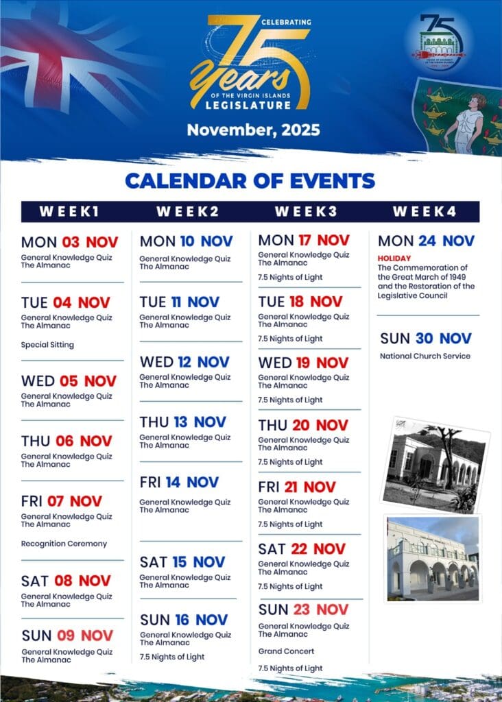 Celebrate the 75th Anniversary of the Restoration of the Virgin Islands Legislature: Completely FREE! Under the theme: “Honouring the Past, Shaping the Future: The Virgin Islands’ 75-Year Journey Toward Self-Determination.”